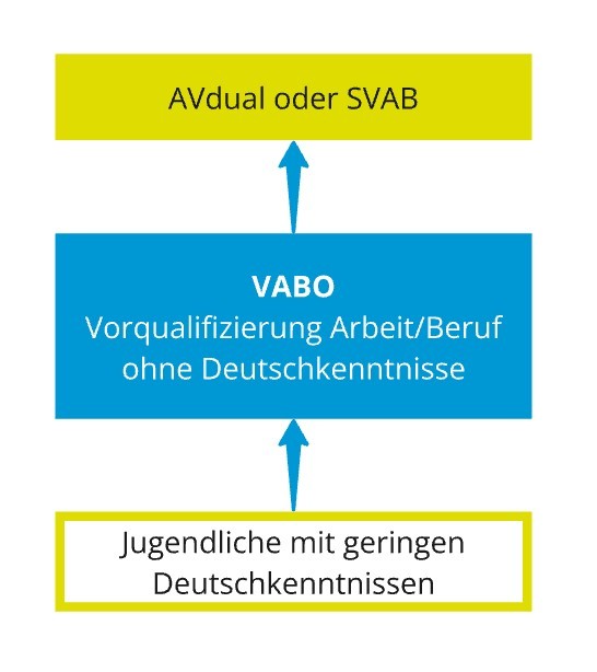 Das VABO wendet sich an berufsschulpflichtige Jugendliche, die über keine oder nur geringe Deutschkenntnisse verfügen. Während des VABO wird auf eine Berufsausbildung, wie auch auf den weiterführenden Bildungsweg vorbereitet. Durch individuelle Förderung werden die Schüler/-innen neben den Fächern Mathematik, Deutsch, Englisch, Lebensweltkompetenz und Religion auch in Computeranwendung und Berufsorientierung geschult. Parallel zum Spracherwerb werden ihnen gesellschaftliche und kulturelle Werte vermittelt, ihre Allgemeinbildung vertieft und soziale Kompetenzen gefördert. Ergänzt wird der Unterricht durch Förder- und Wahlpflichtangebote wie z. B. Sport, Musik, oder Kreatives am PC. In berufsbezogenen Projekten und Praktika machen die Schüler/-innen ihre ersten beruflichen Erfahrungen. Die Berufsschulpflicht ist mit dem Besuch des VABO nicht erfüllt.